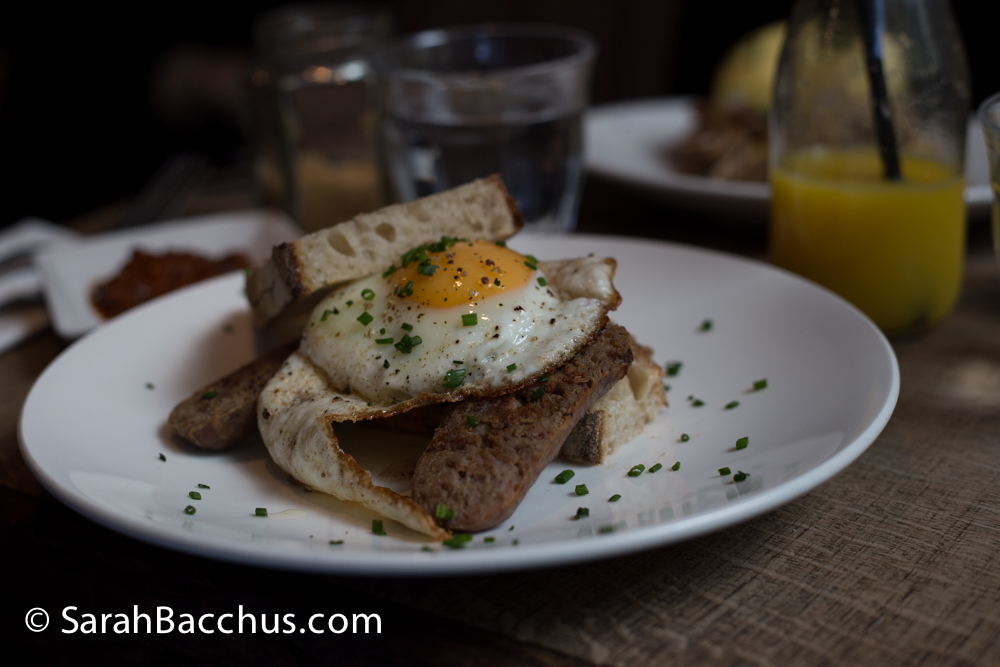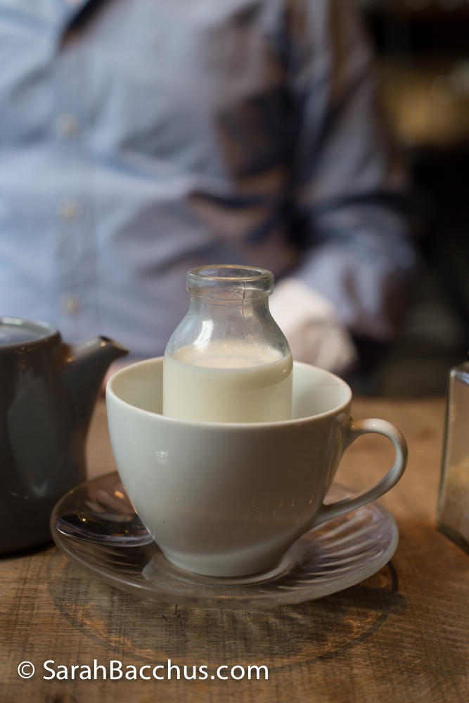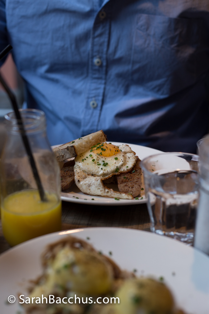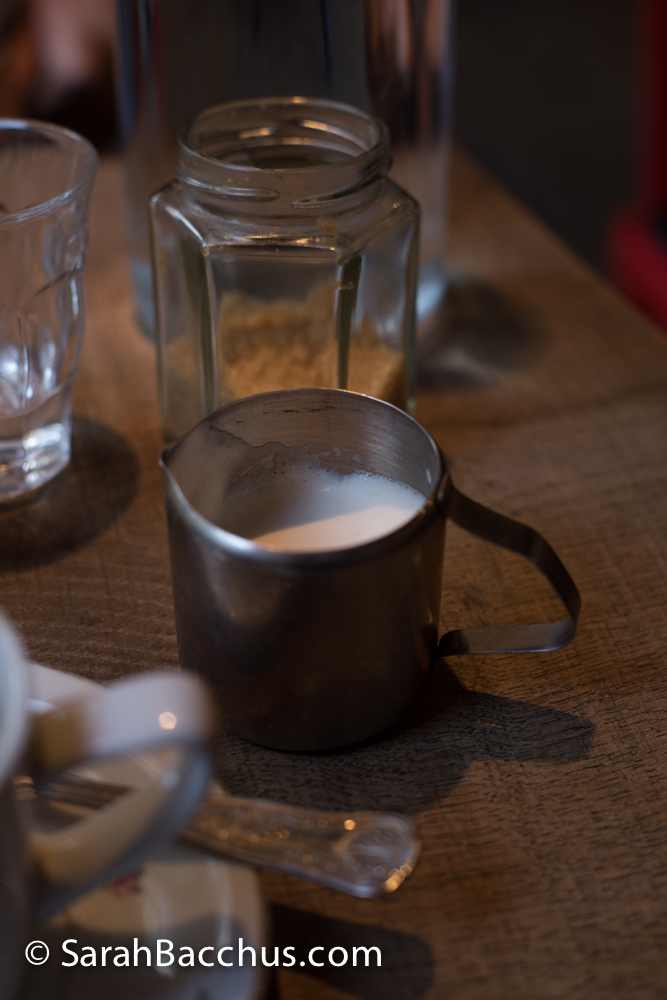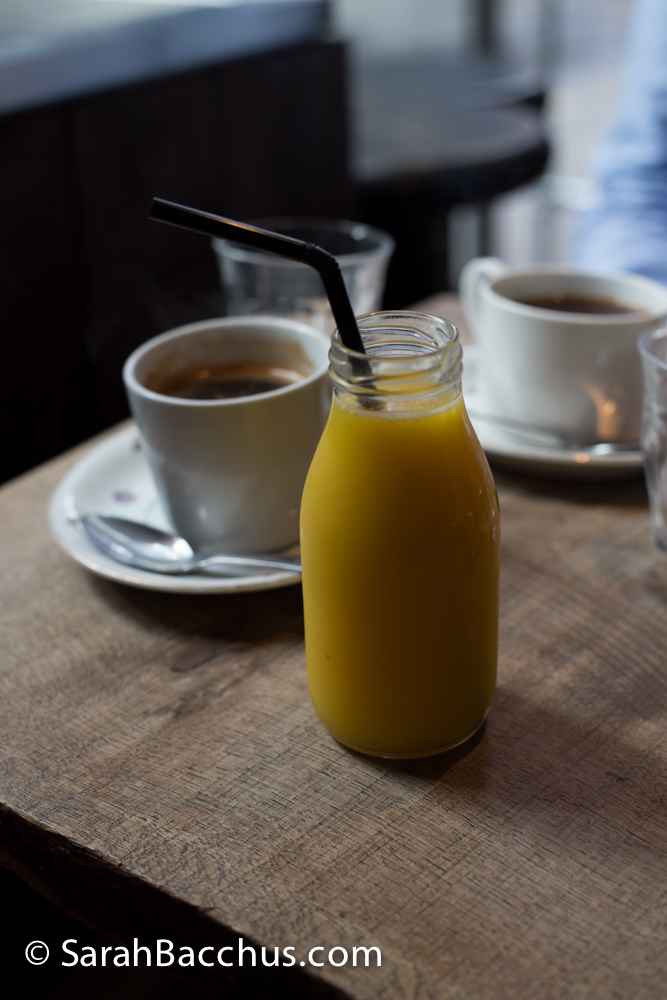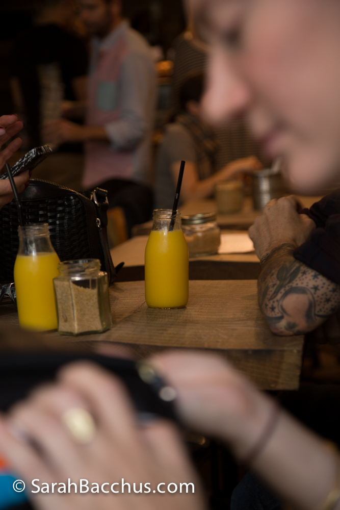 We indulged in a drop of freshly squeezed orange juice that was sublime and complemented or brunch so well. Served in mini bottles they looked just perfect nestled on the little wooden table.
