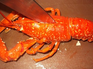 Remove the lobsters and set aside to drain. Place a chopping board on a damp kitchen cloth to prevent it from slipping. Place the lobster on the board and hold firmly by the tail. Find the cross on top of the lobsters back and using a large cooks knife cut through the shell towards the head. Turn the lobster around to then cut through the tail.