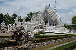 Then we went to the white temple, Wat Rong Khun, which was designed by Chalermchai Kositpipat, a famous Thai artist. It is spectacular and so different to any temple I have seen yet. Quite macabreand yet strangely entertaining there are skulls hanging from trees, a moat of hands reaching up from’hell’ in as a bridge escorts you over them away from temptation towards redemption in the safe confines of the temple.