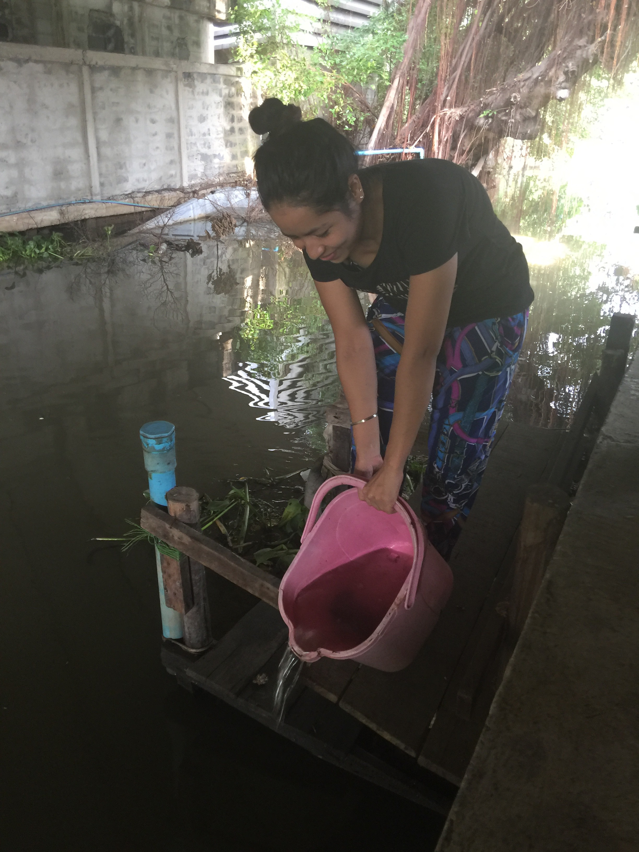 We abandoned the walk, drove to the moobaan entrance and walked to the kong with another bucket on top of the first to prevent escapees. The dog must have felt a little short changed on her walk that day. When it actually came to setting them free, I swear the fish faltered in their bucket before launching themselves back into the festering waters. As well they might.
