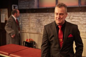 Yates’ subtle reverie at the altar is interrupted by the maelstrom that is the manager, Kidd – a whirlwind of nervous energy and bitterness. Stephen Tompkinson shines in the part, grabbing the character and thrusting upon everyone his ambitions of success, whether or not they ask for them. He is arrogant and angry, the kind of man who is going places but always quick to blame others for his own faults.