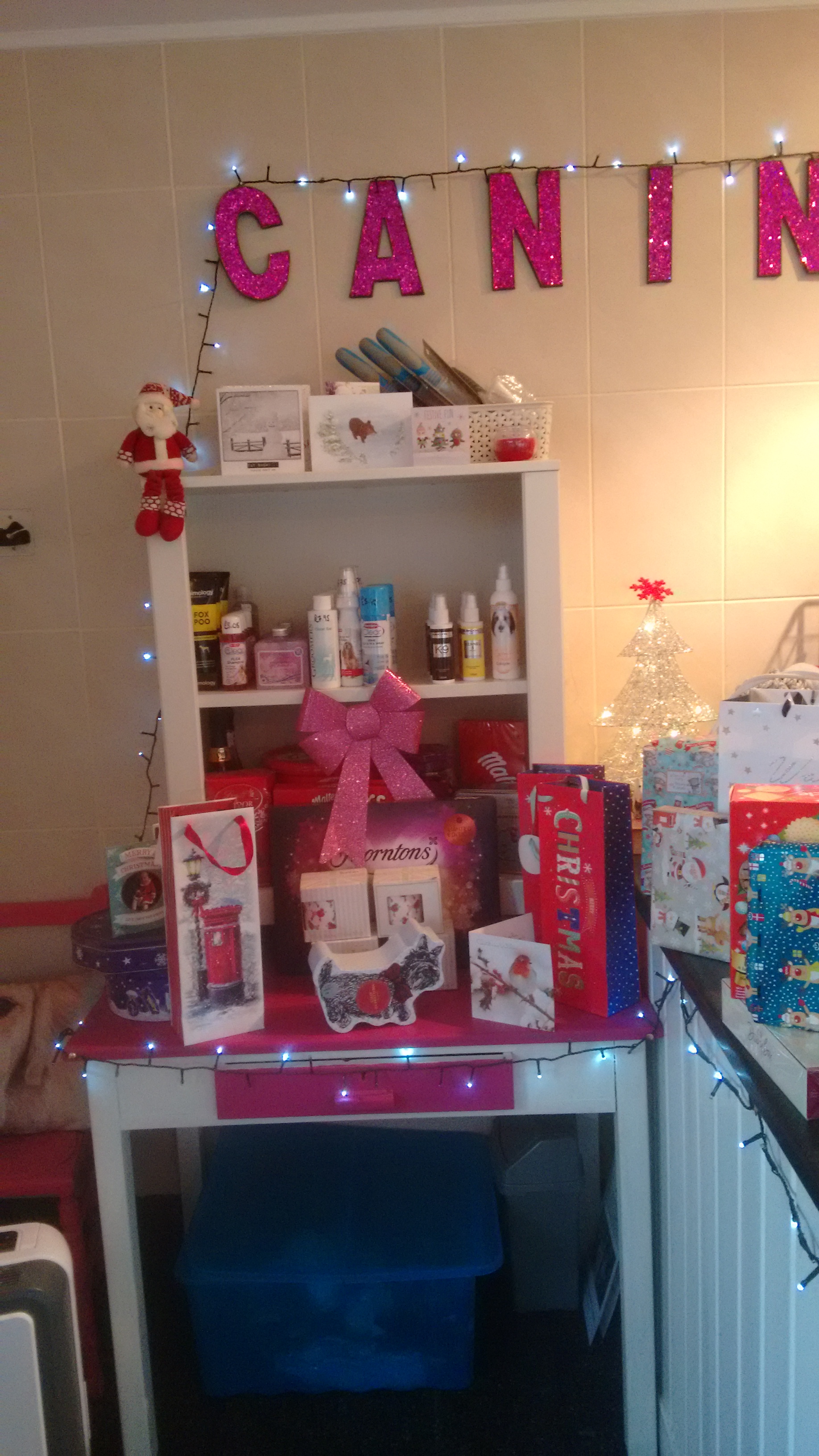 This year, Stephanie has created a bountiful Christmas ‘market’ in the salon, with gifts galore for those most important members of the family, the dogs, which expect their housekeeping staff (us) to at least look at, and then to buy. Or is that just Rosie and Polly? So we do, and are glad that we have. How pretty they look.