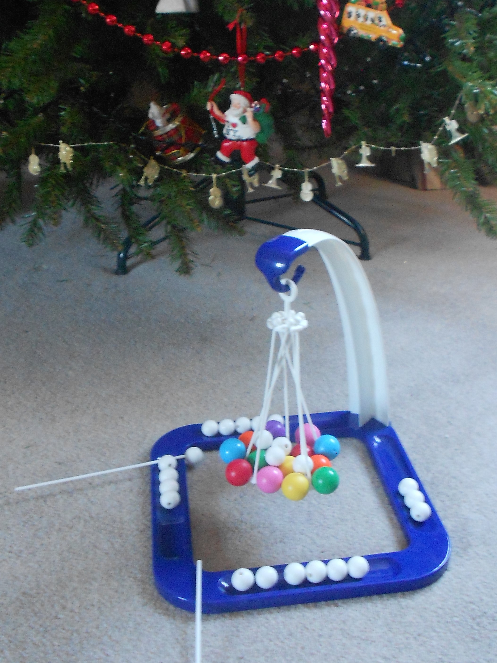 Coloured balls are suspended from a hanger and each player has a white stick and an equal amount of white plastic balls, each with a hole in them. The object of the game is to place the white balls onto the coloured ball platform using the white stick. One false move, too may balls and the platform parts and white balls cascade into the tray below. It’s a game of dexterity and balance.