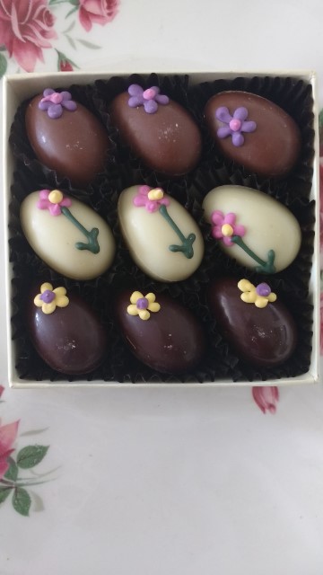 Champagne Truffle Eggs BOX OF 9 | 9 X 9 X 2CM | 90G | £11.50 Individually hand-decorated with Royal icing spring flowers, these dark, milk and white Swiss chocolate eggs reveal a rich Champagne and Marc de Champagne truffle filling.