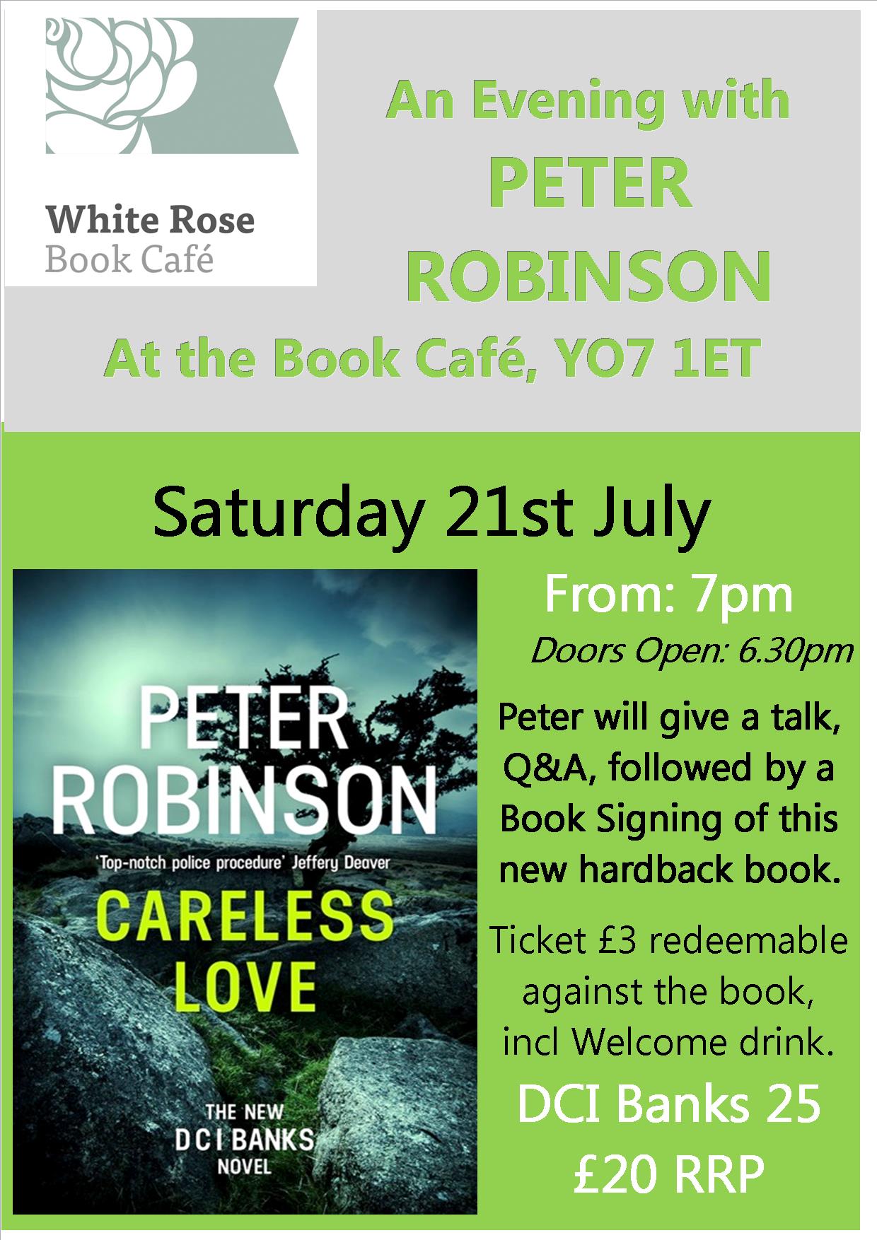 And on 21st July why not spend the evening with Peter Robinson at the White Rose Book Cafe YO7 1ET from 7.00 pm with this bestselling author of the DCI Banks novels