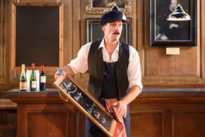 This production has managed to create a hilarious Dogberry! So many versions don’t quite know how to portray the clowns. To make Dogberry (brilliantly played by Louis Bernard) as the cafe owner who is basically there throughout, actually manages to give Dogberry a genuine and truthful setting which he so often lacks. His assistants, who are just as stupid as he, are a joy to behold. Accordion-playing Verges (Scott Brooks) has great fun being the deadpan accomplice. Bernard’s inspiration is Jacques Tati and it works a treat.