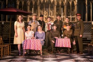 Co-directors Ben Horslen and John Risebero have set the piece in the village square of Messina, in rural France. WW2 has just finished and there is a joyous atmosphere. British troops are passing through and all seems well in the world. This however creates the potential for accents: the locals are French, after all. Much of Dogberry’s speeches are French gibberish and set the tone perfectly.