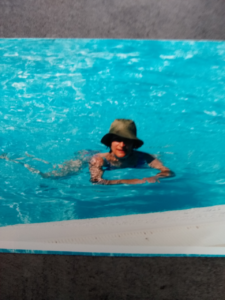 And here we have a photo of Margaret Graham, AKA Milly Adams showing the kids how it’s done on a holiday in Italy some years ago. Let’s be honest, I dye my hair, well, who wouldn’t? And the water bleaches it, and so does the sun, hence the hat, and the head up in the air, looking ridiculous, stance.