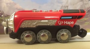 My experienced young reviewer loved the bright-red colouring and he immediately worked out the neat little control buttons on the top of the engine. He laughed with pleasure as it moved forward with one button, backward with another, and just made funny engine noises with the middle button.  The engine certainly does move – requiring retrieval from under the sofa several times – one of the privileges of being a Grandma.