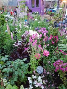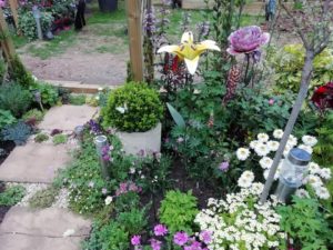 Lynne had decided that birds, bees and butterflies must be attracted, nature must be encouraged, but her grandchildren were not forgotten. Lynne determined that this place must be one of enchantment not just for her, the birds, bees and butterflies but for her grandchildren, and husband. So she included coloured lights and flowers which were clearly artificial but which made statements amongst the real plants. Lynne says, ‘I didn’t want block planting so wove it together by colour. I mixed heights so that you didn’t see everything at once. It became a discovery when looking at it from different angles.’