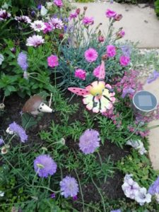 Lynne hid butterflies, dragonflies, ladybirds and fairies within the plants. And even added a few little stakes with pigs, cows and bees for my youngest granddaughter to discover. She added statues of children and animals and currently working on the bird bath, bird table and wild flower area.