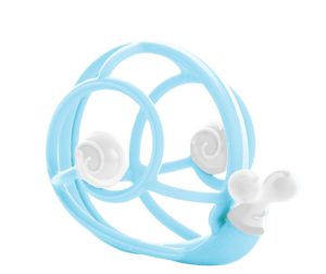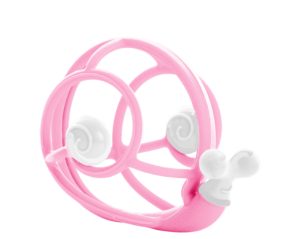Firstly it looks extremely attractive, in pink or green. It’s big enough to grab Baby’s attention but very light, so easy for even a 3-month old to grab and hold – and of course, take straight to their mouth. The whole toy is made of food-grade silicone so no concerns when Baby chews on Leo’s various bits, and the snail’s feelers are designed to resemble a dummy (pacifier in the USA) which is a clever additional feature.