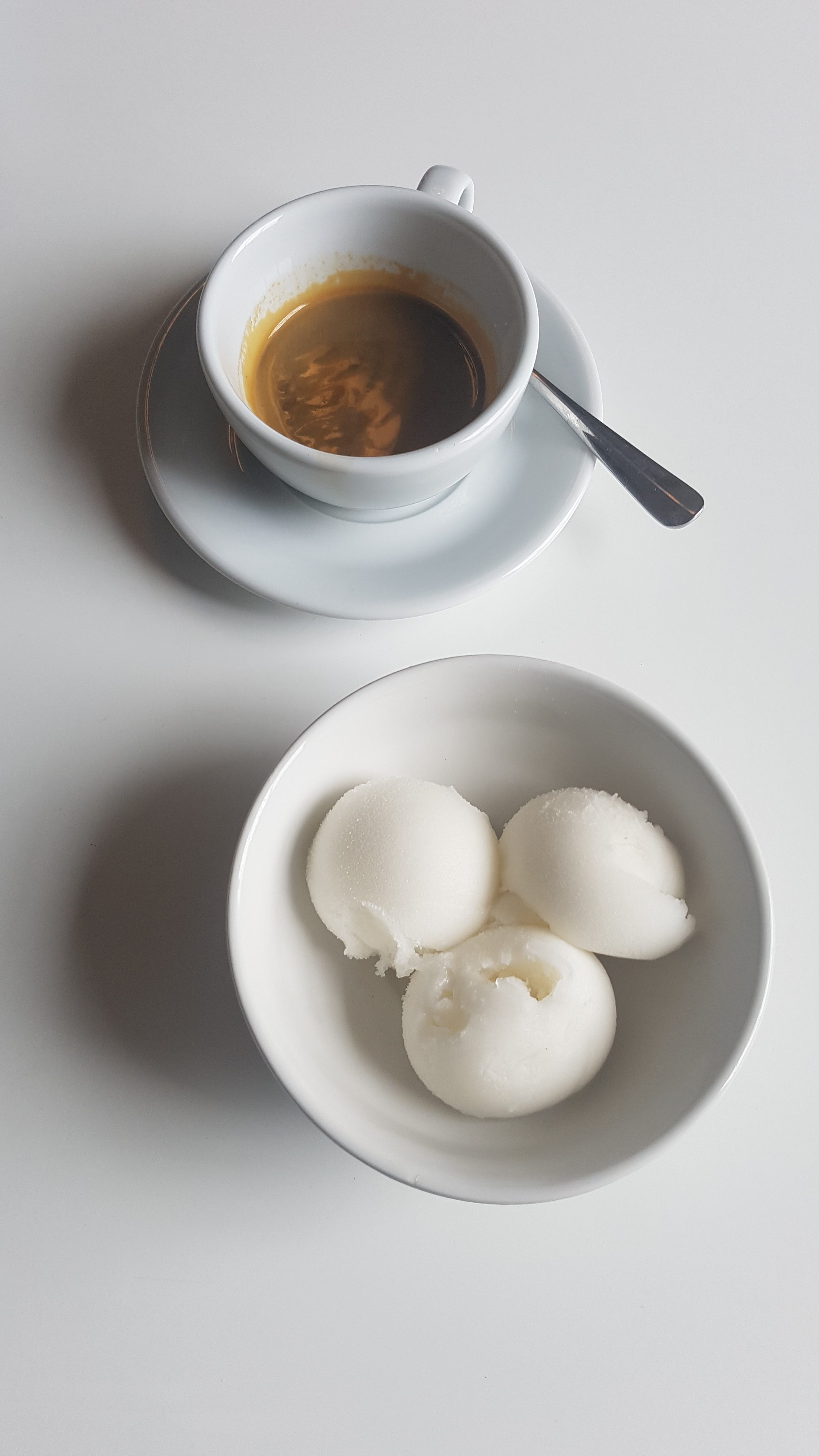 To finish, three perfect scoops of Prosecco Sorbet, light, delicately perfumed and meltingly soft. This not only refreshes the palate but is a perfect accompaniment to a double Espresso.