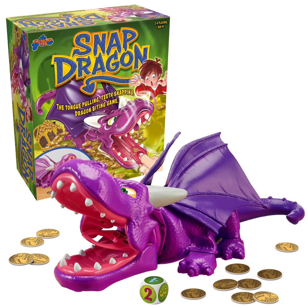 It centres around a big purple dragon. Each player takes it in turn to throw a die, and then pull on the dragon’s tongue to see if he snaps at them. If he doesn’t, you gain a gold coin, but if he does, you lose one.