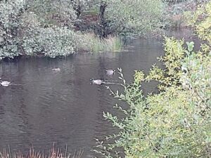 Once they reached the resevoir they passed ducks that quarrelled, took off, landed, took off, and two swans took off too, fed up with the ducks The ducks soundeda bit like Margaret and Dick: chatter, grump, no speakers. Chatter again.
