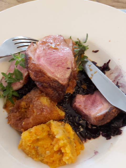 I had Grassingham duck breast (cooked pink), sauteed mandarins, ginger and potato croquette, while Dick chose Slow roasted lamb shoulder, honey roasted carrots and parsnips, redcurrent reduction.