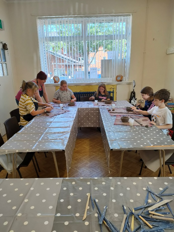 During the week the CCA hosted a new programme of training with MBC Art Wellbeing which delivers free activities for children. This programme is funded for the next year, particularly during school holidays,which thrills Marion and the committee Pottery class was the kick off activity and I daresay Marion got stuck in. Roll on the 24th and the making of Wind Chimes