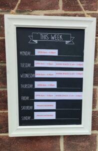 The  new board is on the wall outside, letting the community know our opening hours and our Warm Spaces days and hours.
