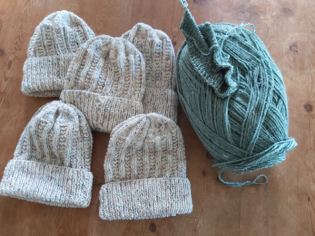 Frost Magazine team are busy knitting in between work, and have moved on from beige to green. They are not perfect, oh dear me no, but warm and we are trying not to drop too many stitches and get the tricky sewing up of the brim ticketty boo.
