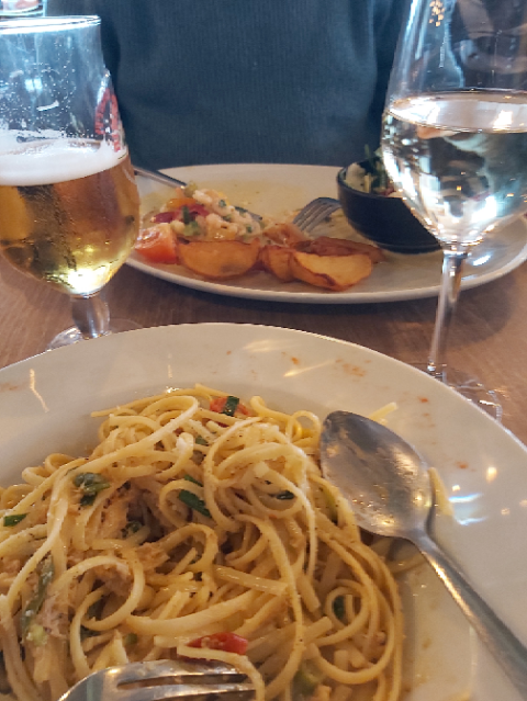 Dick had Pollo Pescatora: chicken breast with prawns, peppers in a white wine garlic sauce, with big chips and salad. A short wait, of course, as each meal is prepared especially. Drinks were brought immediately .