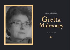 She was a wonderful person who brought laughter and warmth wherever she went. Gretta was a remarkable person; she shaped so many lives for the good and she will be much missed. To use her own words, spoken by Tyrone Swift, “May you live as long as you want to, and want to as long as you live . . .”