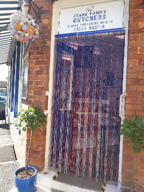 Frank Family Butchers have not long been in Thirsk but have certainly made their mark, and not just because the doorway ‘dangles’ makes one feel that you simply should make an entrance as though about to do a ‘turn’ on stage. The dangles are actually, to keep out flies and all flying beasts. Frankly, a very good idea, Mr Frank.