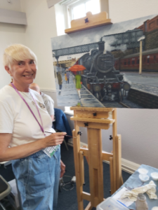 Now to Demonstrator Chris Pulham and her Railway Art which brought me to a screeching stop. I wanted to learn more. Chris explained how she had built up the colour of the maroon train to make clear the grubbiness residue garnered from the miles it had travelled. She had then added the people, which made the scene alive with movement. I loved it. www.chrispulhamrailwayartist.co.uk