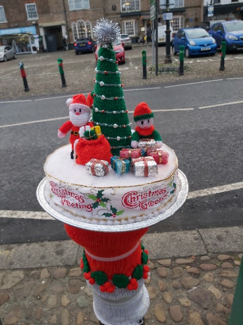 After sinking into our armchairs, to eat our first mince pies of December, it was time for a saunter. There in the Market Square, opposite The Golden Fleece, we saw that the Yarnbombers had decorated for Christmas.