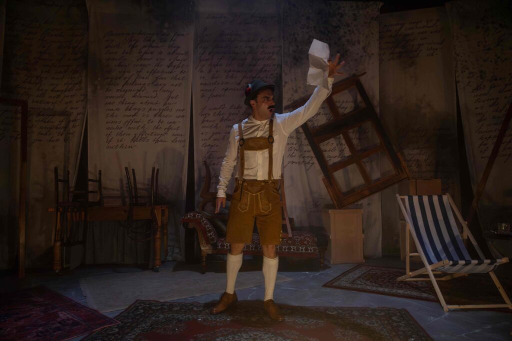 And it is ‘dreams’ that is at the core of this play. A wonky doorway and window frame on one side of the stage, a straight one on the other, representing, one assumes, the closeness between sanity and insanity. The play plods along at a dull pace until the penultimate scene – the climax and the whole point of the production: where an elderly Freud faces a triumphant Hitler. A scene reminiscent of Salieri and Mozart, or when Frankenstein finally faces up to his monster… whose head are we inside, at this moment? Has it been a Freudian dream all along? Apart from this magnetic moment, the play had too many scenes, scene changes, lighting changes and characters. Although Jonathan Tafler played Freud convincingly, he was similar throughout. With no obvious journey, he was stuck in a character without much emotional depth. Sam Mac plays a few versions of Hitler, from child all the way through to German Leader. He has more growth, but his ‘temper tantrums’ are what any of us expect to see. Are we watching clichés or well-rounded characterisations?