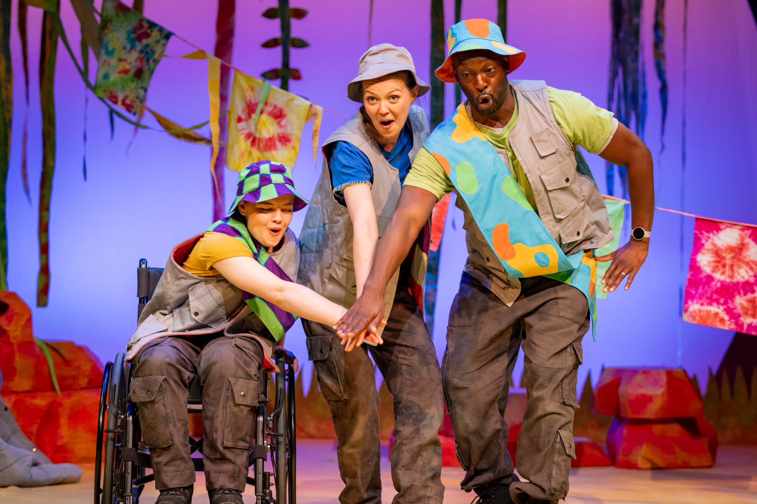 The performers – creating a relaxed atmosphere throughout – appear calm and in control. Wide-eyed Amelia Gabriel, casual Frankie Turton and cool Jack Benjamin guide us through a 55-minute adventure that has genuine surprises, too. Plus plenty of witty one-liners to check the adults are still awake!