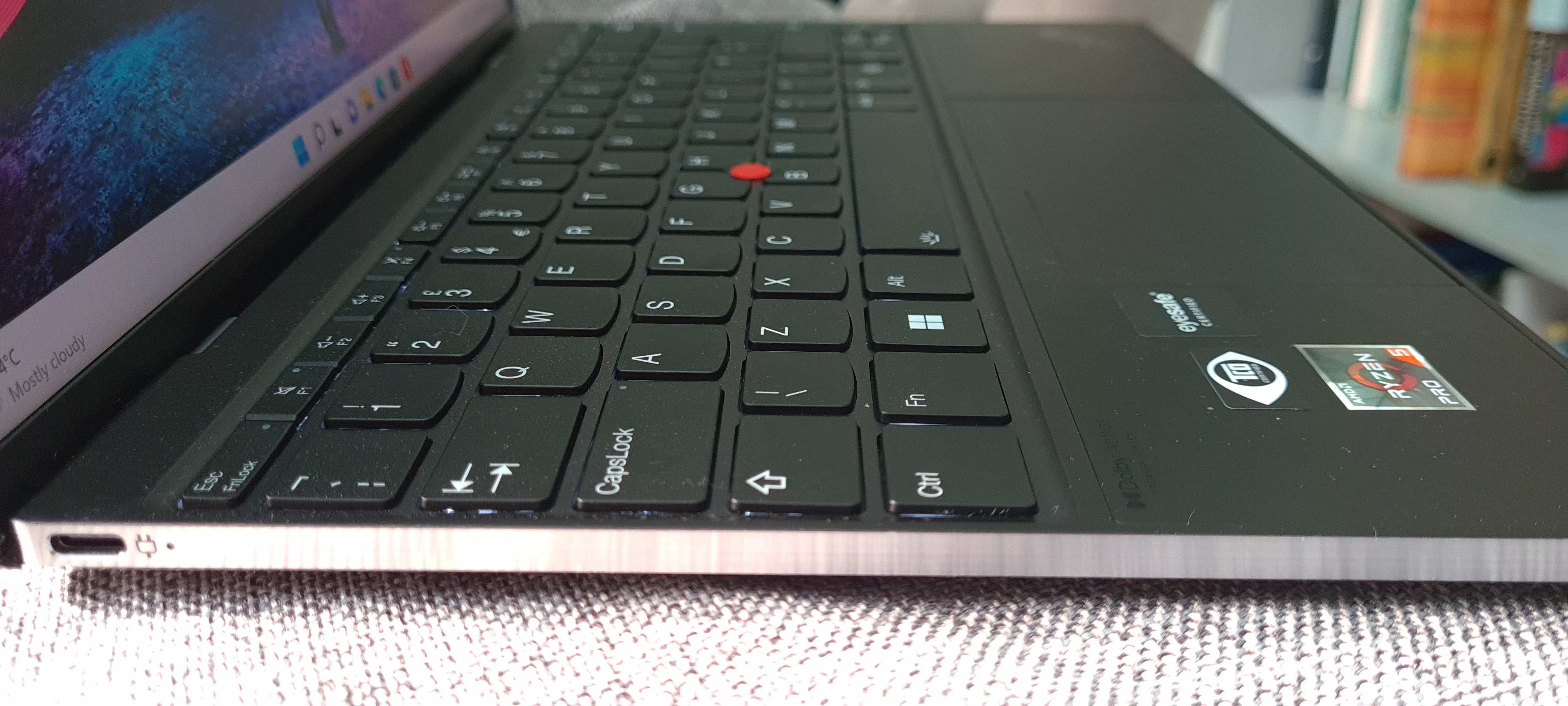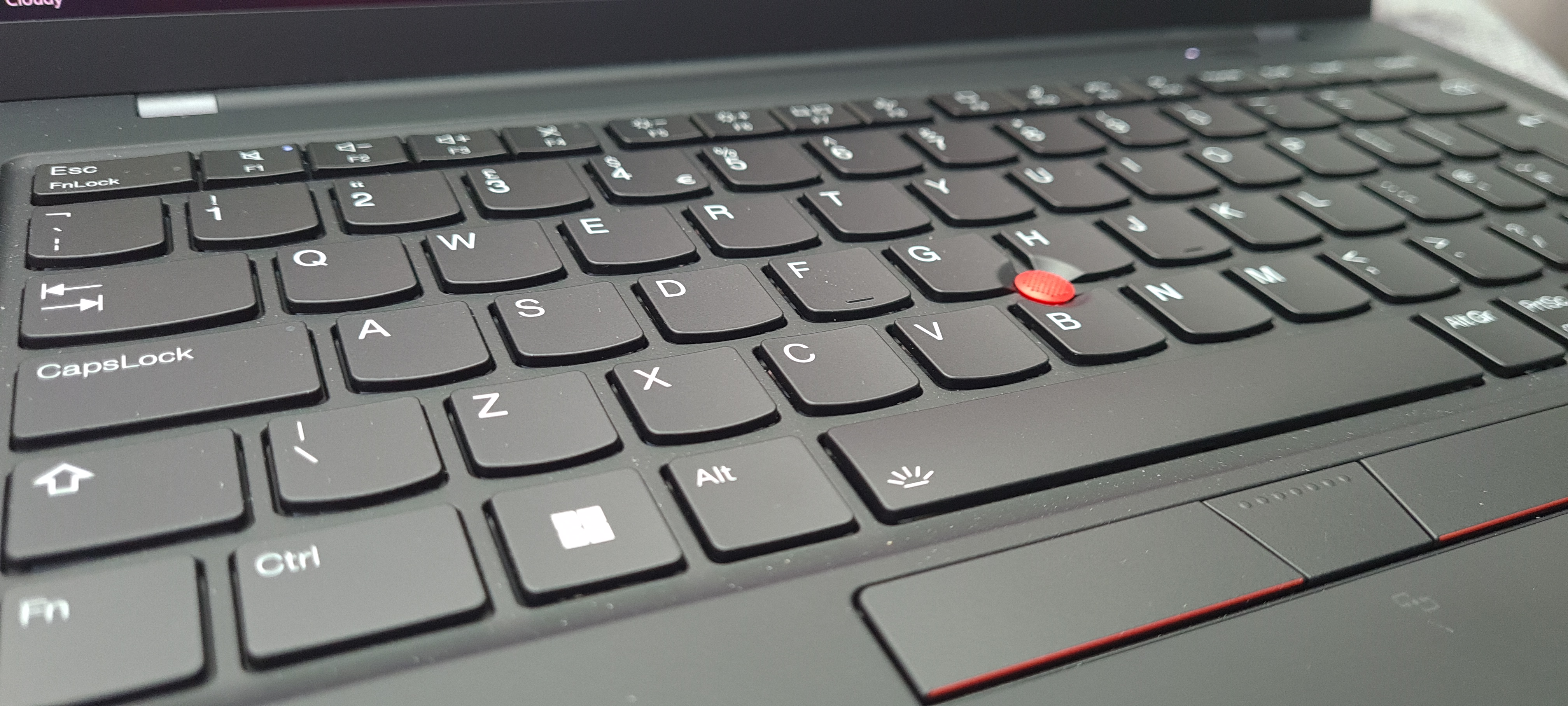 Almost into a week in using it and it has to be said that typing on the keyboard is a lot of fun. The keys have some base lighting which helps in darker conditions and I found that the keytrokes aren’t very deep, which is probrably down to the slim nature of the machine but each key is well separated out. Lenovo have this thing and the full-size keyboard layout is comfortable to type on.There’s also a fingerprint reader lock for basic biometric security. For those familiar with think pads, Lenovo has developed the TrackPoint; a red button in-between the keys which acts like a mouse, although it has to be said takes some getting used to. Here they have added a new double-tap feature that brings up a range of tools including adjusting camera settings, muting the mic, and even a tool to transcribe speech right into a document. All very good.