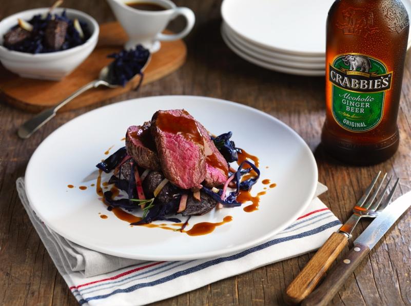 Main; Duo of Venison Loin on thyme & hawthorn jelly served with Original Crabbie’s, warm red cabbage black pudding & ginger apple salad