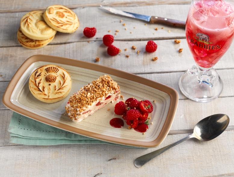 To serve add a few raspberries to the plate with the shortbread & slice the Iced cranachan