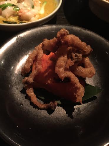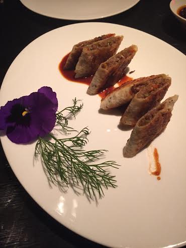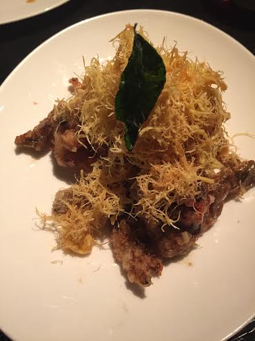 Dim Sum, Spicy lamb lupin wrap and Golden fried soft shell crab with red chili and curry leaf.