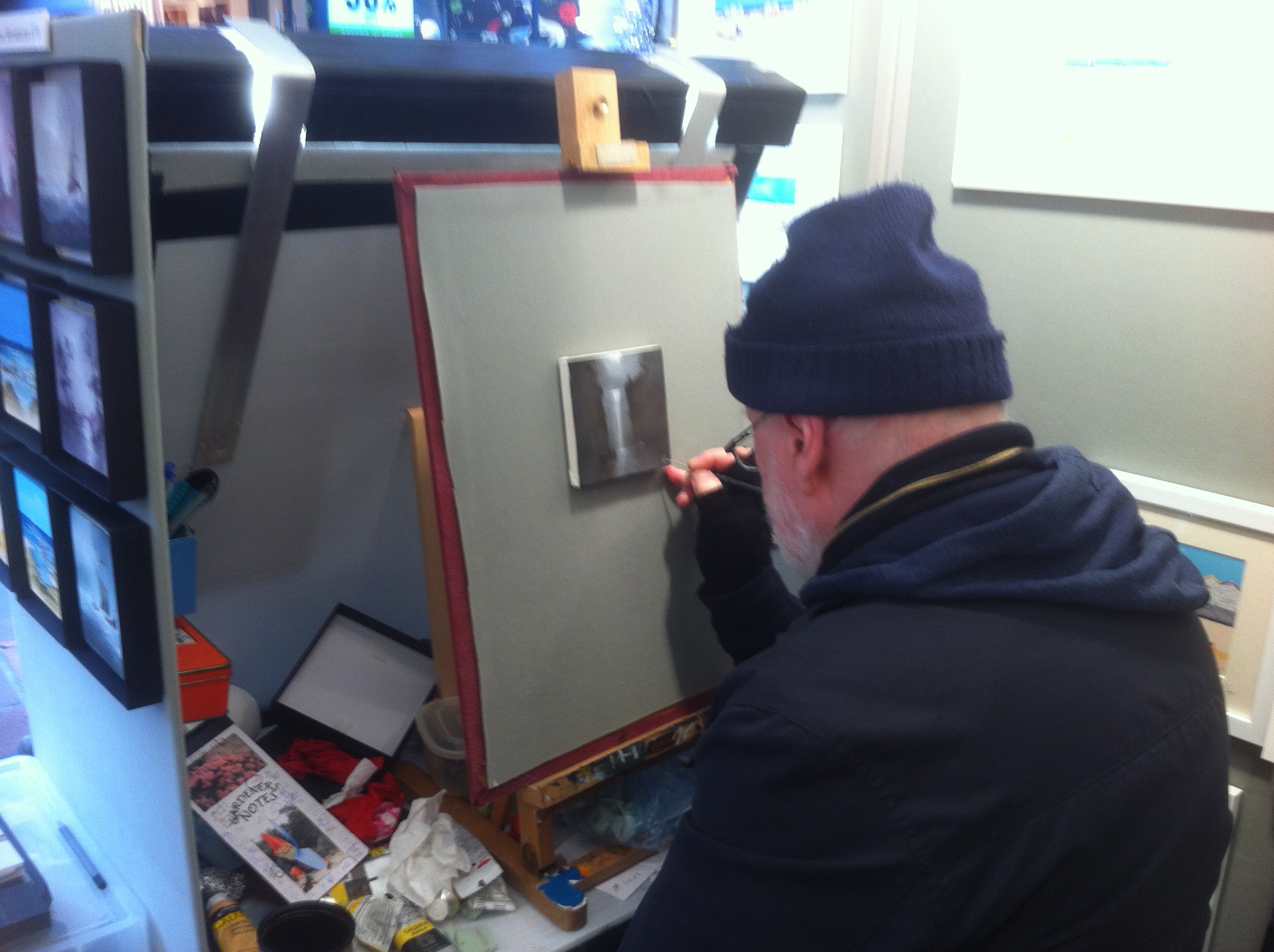 Artist Rob Huxley was hard at work behind a beautiful display of his paintings and I was happy to stop for a moment to watch him transform a small canvas into a boat awash on a dark sea. I hope he didn’t mind me looking over his shoulder, it would drive me mad. Suddenly conscious of this I moved swiftly on.
