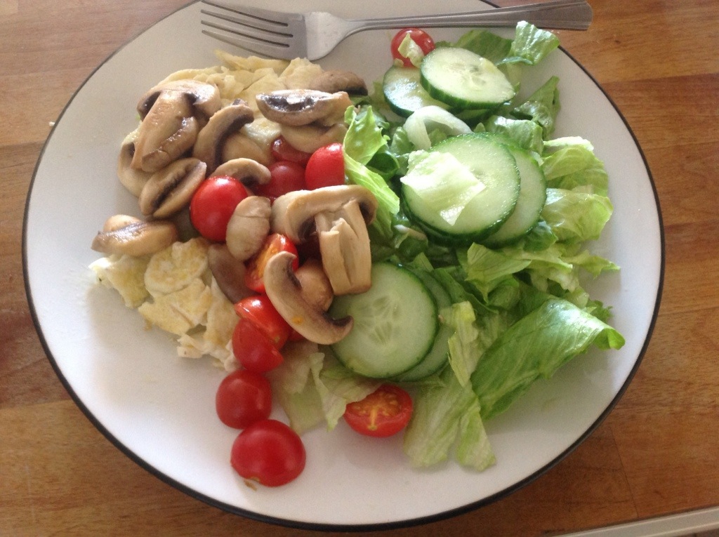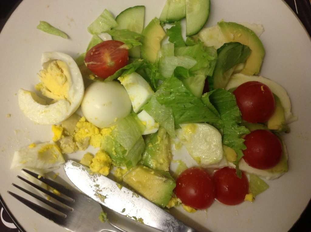 Lunch was a giant fried egg that was supposed to be an omelette (This was my second attempt and the first one obviously made me too cocky), mushrooms, tomatoes, cucumber and iceberg lettuce with olive oil. Dinner was a tricolore: avocado, tomato, mozzarella with boiled egg, cucumber, lettuce and more olive oil. I am not sure what has happened to the old me but if you see her, dust her off and give her a light slap because she will be in shock.