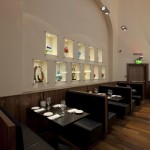 HPlogoAmarone restaurant is majestic inside and out. It is situated in Edinburgh’s financial district, St Andrews Square and is a former safe – known as the ‘Vault.’ The high domed ceiling and archways are the two centrepieces and the tall windows fill the place with light – albeit street lights, as we are booked in at 7 pm.