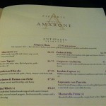 The white walls compliment the dark walnut floor and the drop lighting, ceiling decorations and rows of gallery style photographs, give that contemporary look which Amarone promise on the website. Our Italian waitress offers to take our coats as we get settled in the booth and hands us the wine list and a la carte menu.
