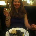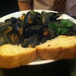 The scallops and mussels arrive in large white bowls, with an extra bowl set aside for the empty mussel shells.