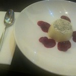 Our waitress puts down the plate in front of me – but leaves two spoons, which makes my partner smile. This is a simple dessert, arranged simply on the plate. No fuss or embellishments – just the vanilla pannacotta with 5 large dabs of raspberry compote surrounding it. My partner puts his spoon in first.