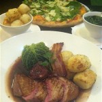 I can’t visit an Italian restaurant and not have a pizza or pasta dish, so we decide to share the pizza verdi – fresh spinach, rocket, ricotta cheese and shaved parmesan with garlic and chilli oil – and the Petto d’Anatra all’Amarone pan seared duck breast, served pink, with an Amarone wine sauce, braised Savoy cabbage, sautéed potatoes, pancetta and confit of figs.