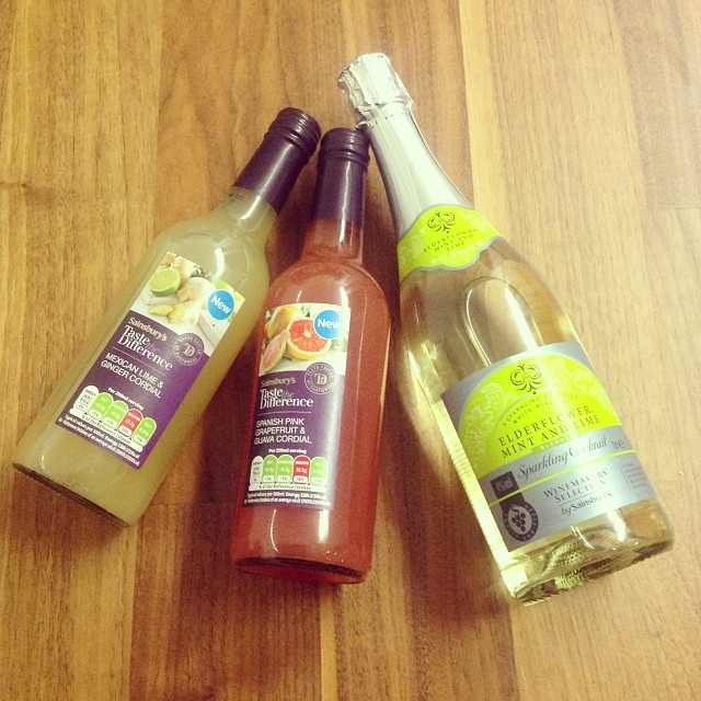We got sent some summer drinks to review from Sainsbury’s: two cordials, Spanish pink grapefruits and guava purée, Ginger & Lime and a sparkling cocktail: Elderflower, Mint & Lime Blended Sparkling Cocktail. Let’s break them down.