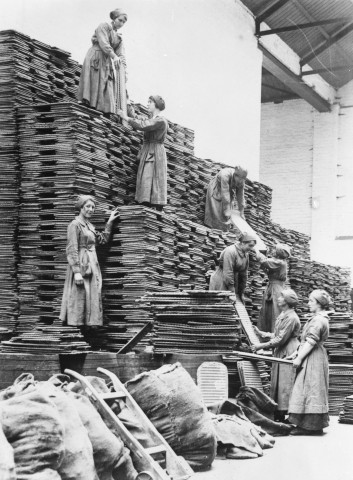 • Women workers stacking oil cakes at an Oil and Cake factory, Lancashire, 1918
