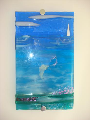All work is fired in the kiln, where coloured frit glass in sand or egg shell form, is usually fused between two layers of sheet glass to make weird and wonderful artefacts. Gloria has been practising as a glass artist for fifteen years and specialises in using float, bullseye, andMurano glass. She can also casts sculptures using Gaffa glass.