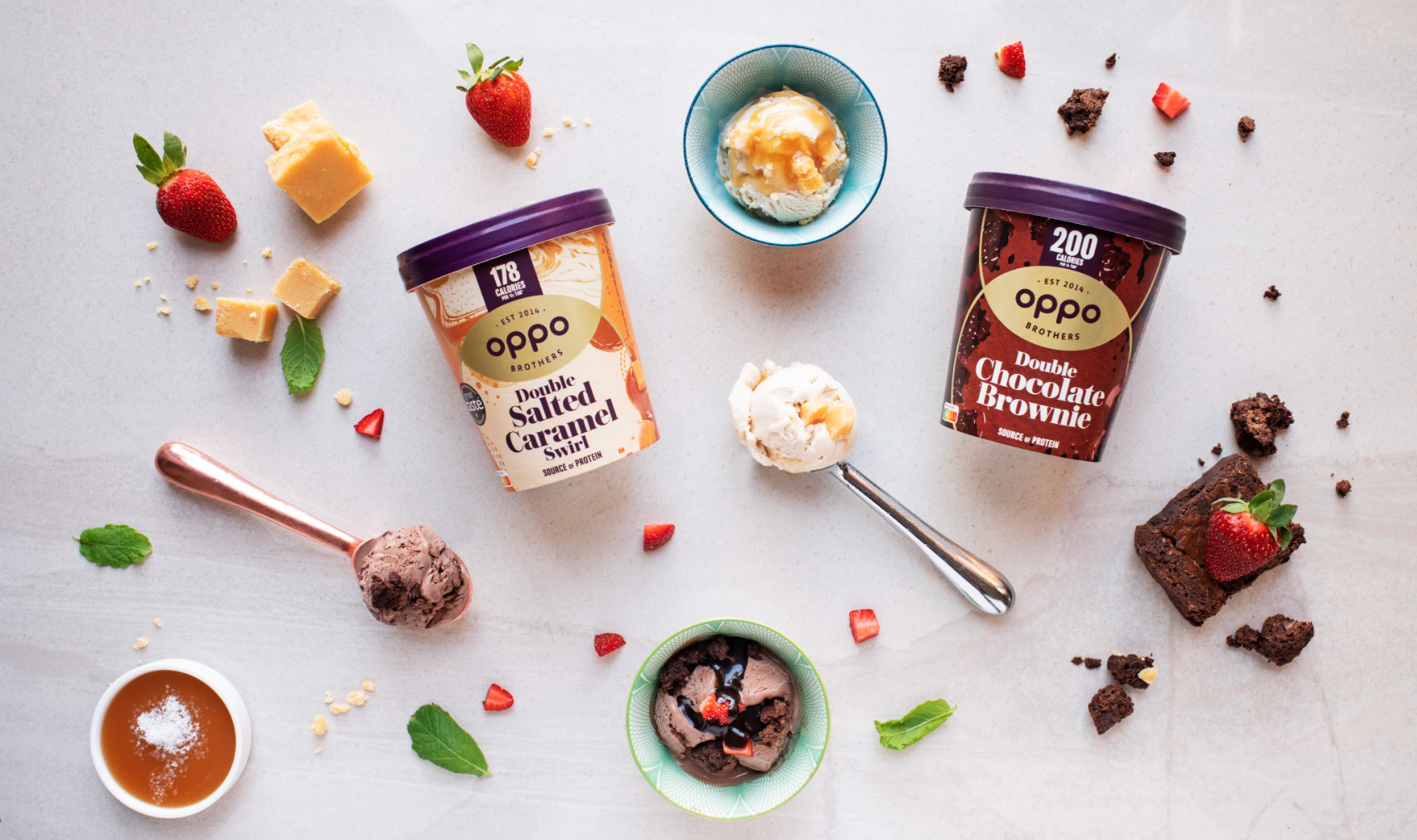 Oppo brings indulgence without compromising health, using all-natural ingredients from all corners of the earth to provide an all round feel-good ice cream. Fresh meadow-grazed cow’s milk is sourced from a sustainable dairy local to the Oppo creamery. Hero ingredients, which keeps the % of sugar and calories at bay include organic Peruvian Lucuma fruit, known as the ‘Gold of the Incas’ which naturally provides a rich caramel flavour for the Double Salted Caramel. Pure Columbian Cacao Fino de Aroma is ethically sourced and used in chocolate ice cream flavours. Stevia leaf brings the sweetness, without the calories or any nasty additives, whilst Madagascan vanilla seeds, cinnamon from the jungles of Sumatra and fruit are bursting with flavour.