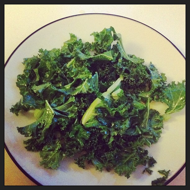 Just take some Kale, cover it in olive oil and add some salt. Then put in the oven for 15 minutes at gas mark 6. Cook for longer if you feel they need it. There you have it: delicious, crispy kale chips. Yum.