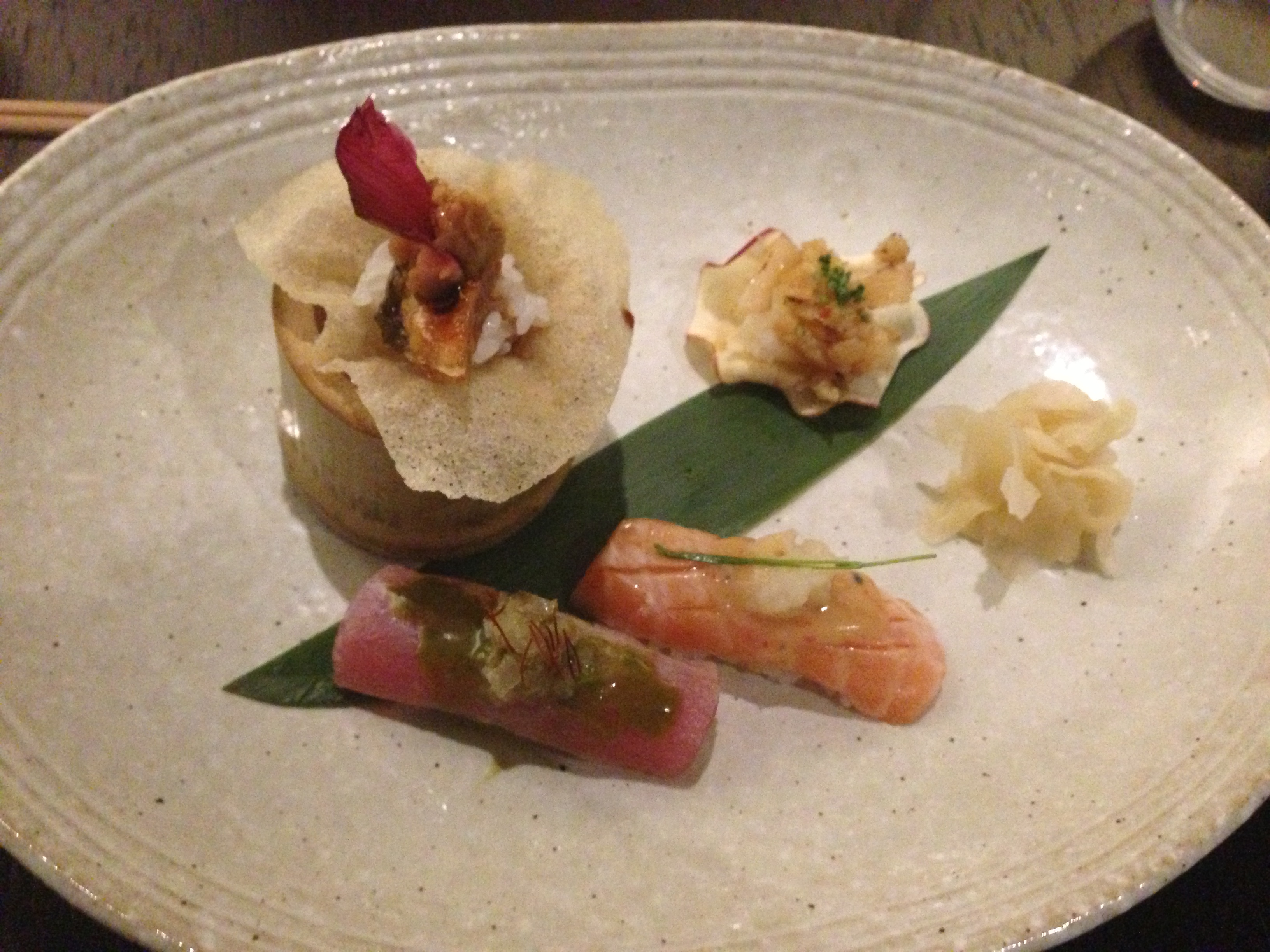We arrived and have a cocktail each. I have the Mexico Sixty Six (Passion Fruit, Cabrito Reposado Tequilla, Vanilla, Black Pepper infused Shochu) and my colleague has the Sugarplum (Honey, Akashi-tai Umeshu, Thienot Brut Champagne) The cocktails are delicious and look amazing. Wabi would be a great place to come and have cocktails with friends or even business associates. The Mexico Sixty Six has the Japanese version of cola in it and packs a peppery punch. It is tasty and different and the ingredients work well together. The Sugarplum is soft and subtle in an ice cold glass. Tasty and refreshing. We then go on to the 10 course tasting meal.