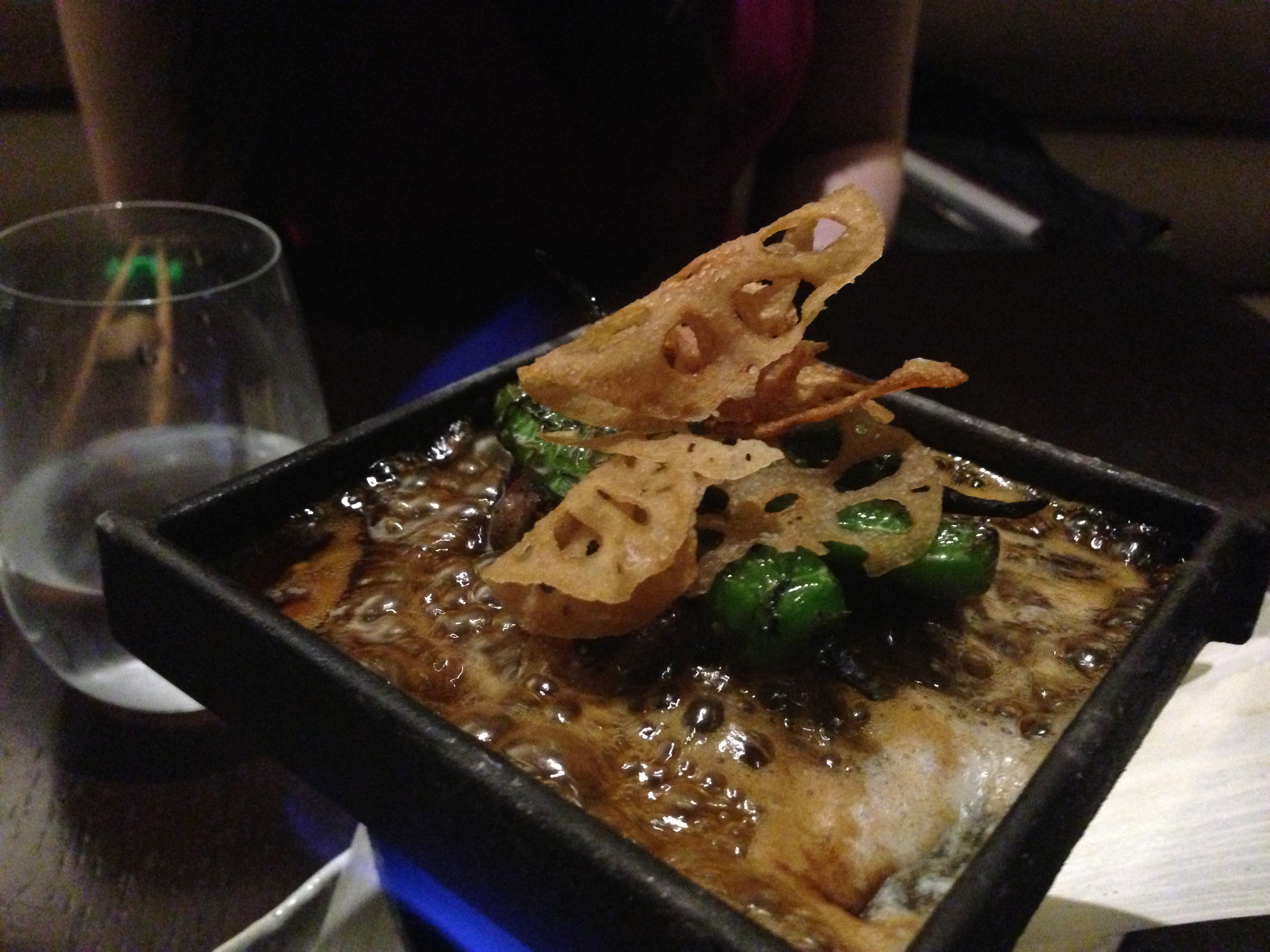 We start with these wonderfully fire roasted edamame. I love edamame anyway but these are extra delicious and come with pork scratchings and a great sweet and sour nasu. A really great sauce.