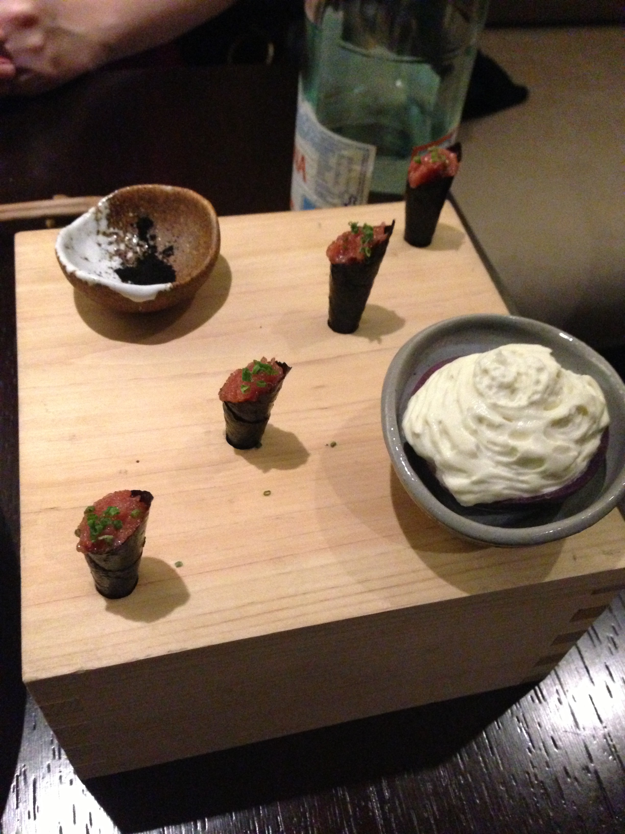 This was a real treat. The tune was perfect, great quality, and the scallops and salmon were also of the highest order. They were all already marinated so did not need to come with any sauce. A real triumph of cooking. (or not cooking?)