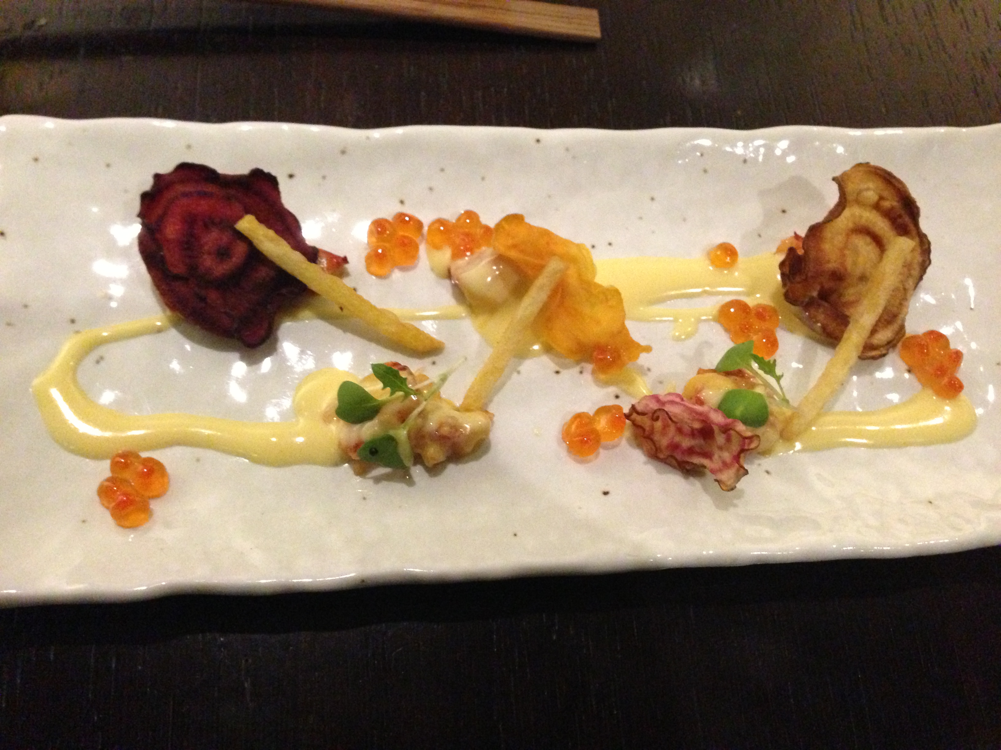 Kombu/butter poached Lobster with Uni, Vegetable Chips and Yuzu-Truffle-Egg Dip
